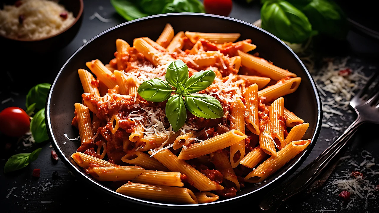 Pâtes, sauce tomate, huile d’olive extra vierge et basilic