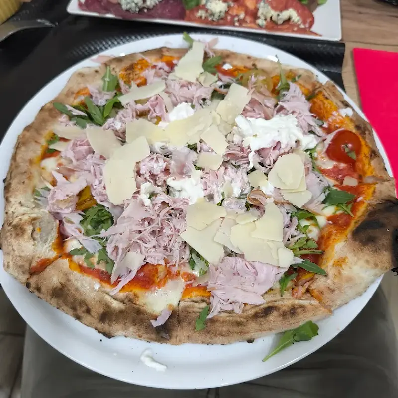 Sauce tomate, mozzarella fior di latte, roquette, tomates cerises, jambon de dinde, stracciatella di burrata et copeaux de Grana Padano