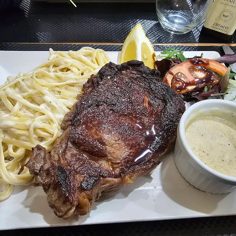 Filet de boeuf 200gr, crème fraîche, sauce au choix : champignons ou poivre ou gorgonzola et linguine même sauce